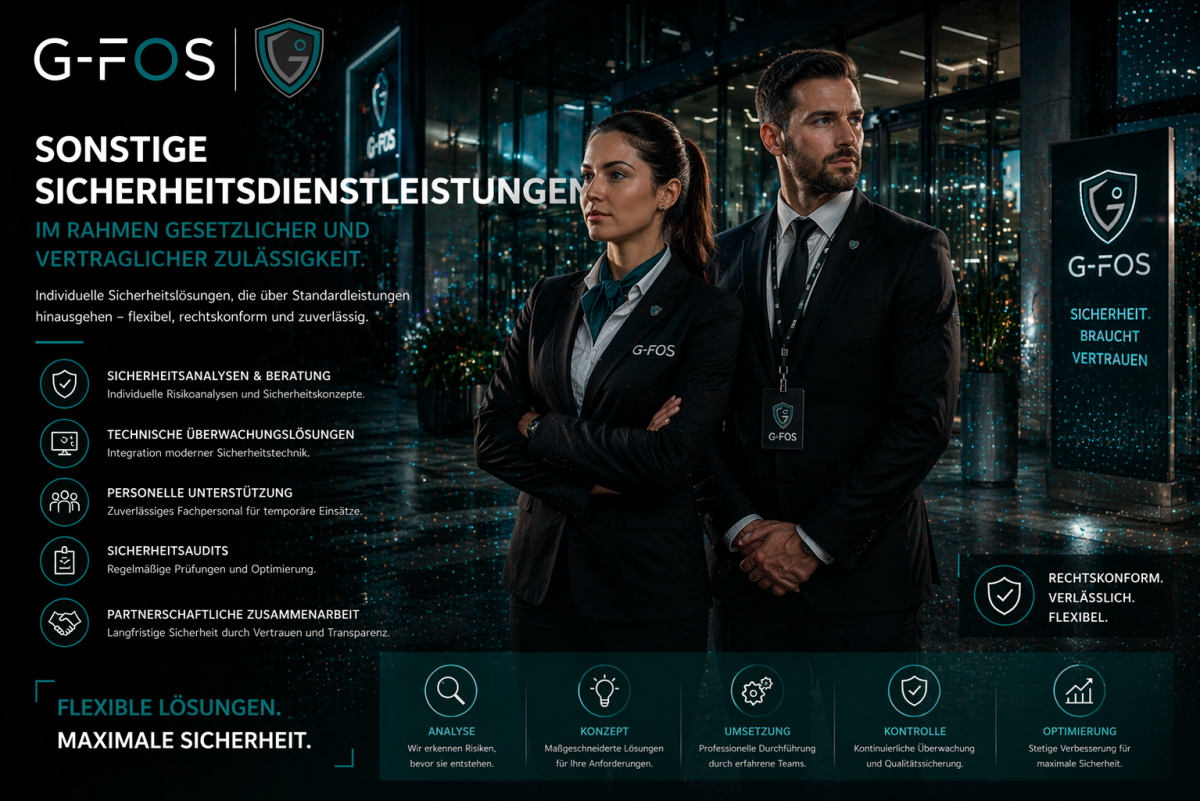 Unter „sonstige Sicherheitsdienstleistungen“ verstehen wir alle individuell abgestimmten Sicherheitsmaßnahmen, die über klassische Leistungen hinausgehen. Dazu gehören unterstützende, präventive sowie situationsabhängige Tätigkeiten, die speziell auf Ihre Bedürfnisse zugeschnitten werden.